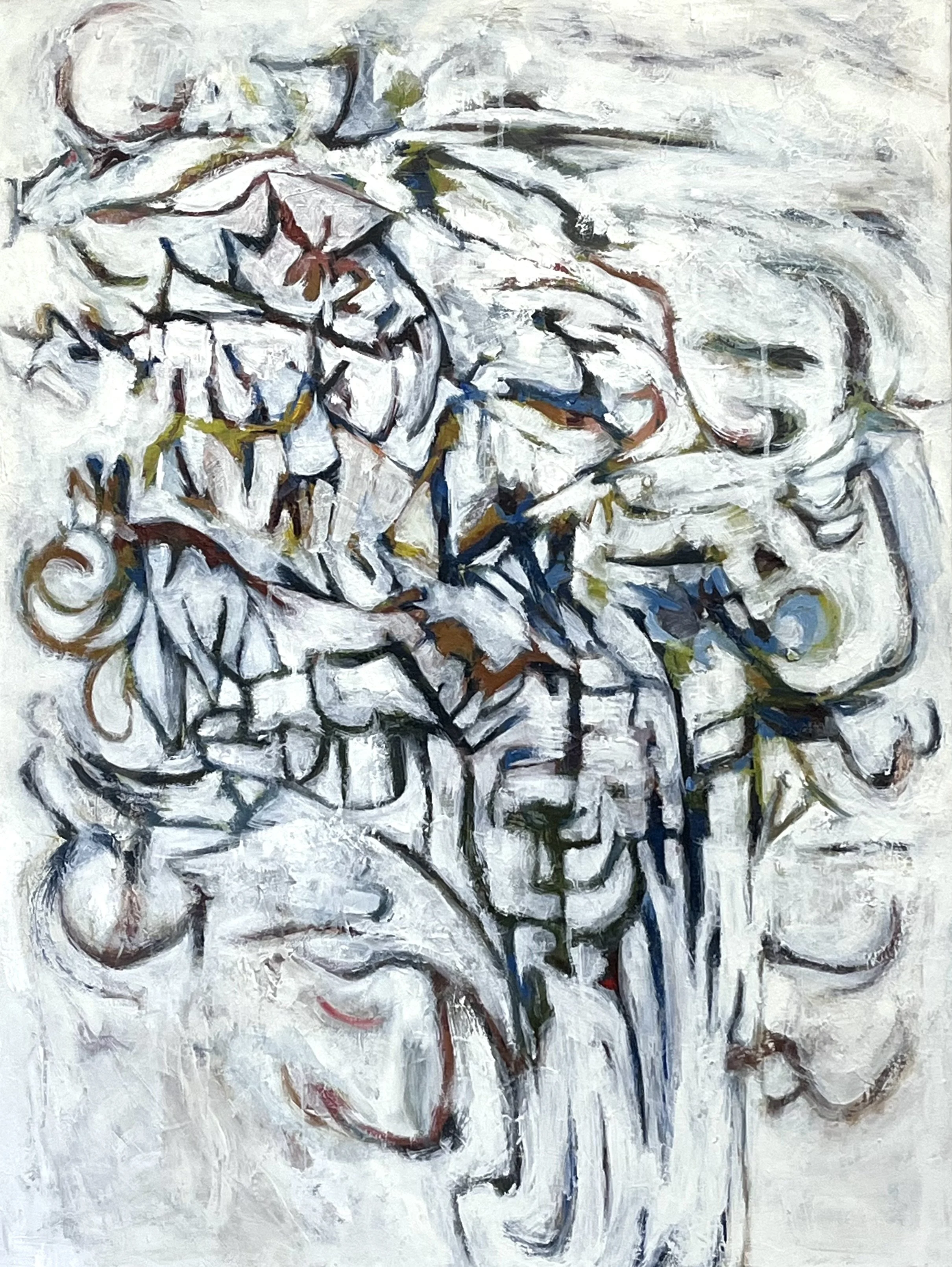 This piece is part of an ongoing series, where the playful, rhythmic marks and motifs are extracted from the background and suggest a sense of musicality, and invoke a calligraphic quality.